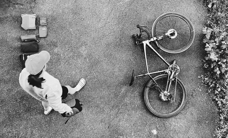 Was meine Taschen angeht, waren mir zwei Dinge besonders wichtig. Dass sie 100% regendicht sind und mir trotzdem das größtmögliche Packvolumen an meiner kleinen Rahmengeometrie ermöglichen. Und dann alles eher windschnittig und möglichst unkompliziert zu befestigen, weil ich mein Fahrrad nicht mit einem Gepäckträger verunstalten möchte. (fight me about it!)