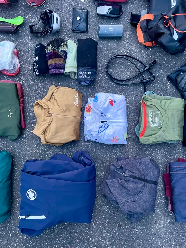 Mir muss warm genug sein, ich muss trocken bleiben. Und bei mir bewirkt es halt auch einfach was, Klamotten zu tragen, in denen ich mich gut fühle. Die mir gut passen und bestenfalls noch ein bisschen schnieke aussehen. Vor allem beim Sport. Das mag oberflächlich oder materialistisch sein, aber dazu stehe ich. Für diese Reise habe ich mich dazu entschieden, auf einen möglichst vielfältigen Reisekleiderschrank zu setzen. Ich weiß nicht, was mich alles an Wetter erwartet, aber aus dem, was ich da eingepackt habe, kann ich sicherlich für jede Situation ein passendes Outfit basteln. Und wie man merkt, habe ich eventuell eine Schwäche für Jacken. Oli sagt, 5 Jacken sind zu viel.